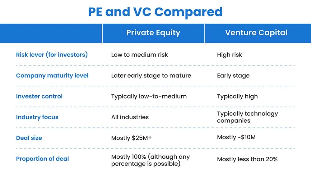 For details on this question, check our deep dive into the differences between private equity and venture capital (or check the list of top venture capital firms). Notwithstanding, the main differences can be summarized as follows: