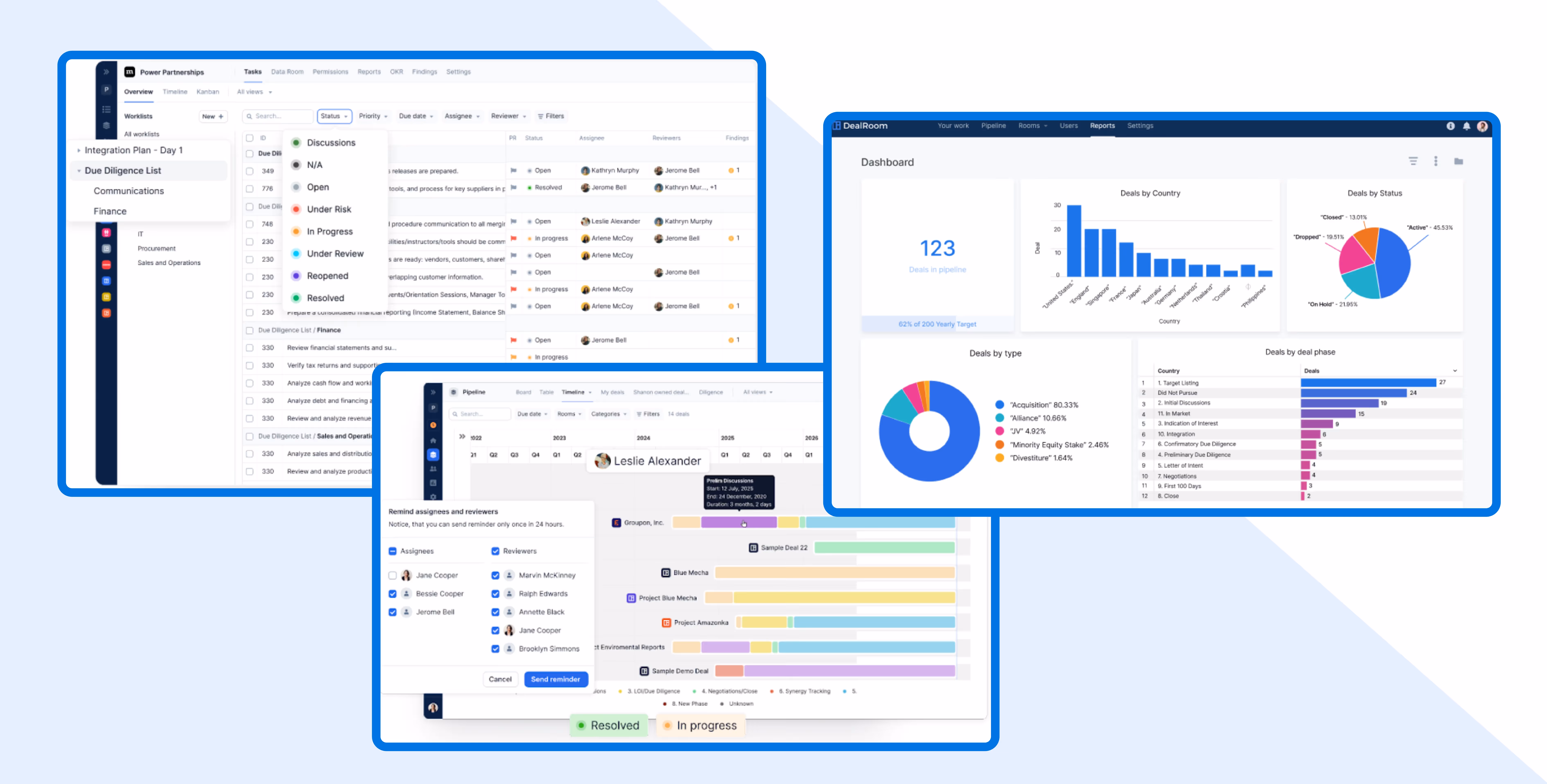 The DealRoom M&A Optimization Platform is designed for agility and speed. By unifying pipeline management, due diligence, and integration management in one easy-to-use platform, DealRoom exponentially boosts productivity, expedites timelines, and reduces costs.
