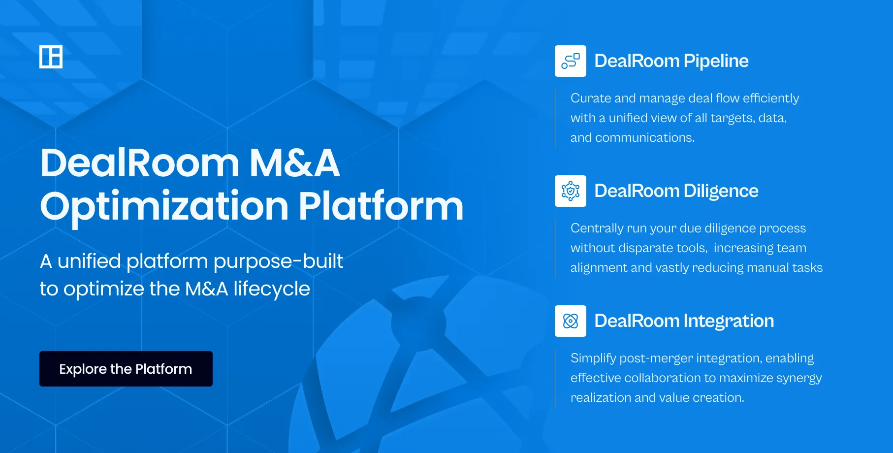 The DealRoom M&A Platform aims to help teams manage their complex M&A transactions. The DealRoom M&A Platform is a purpose-built, unified solution designed to streamline every stage of the M&A lifecycle. From deal pipeline management to due diligence to post-merger integration(PMI), DealRoom provides the tools and features corporate development teams need to optimize their processes, eliminate inefficiencies, and achieve better outcomes.