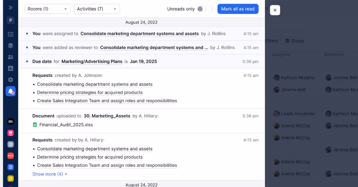 Managing multiple acquisitions means keeping track of hundreds of tasks. DealRoom helps teams stay organized with: