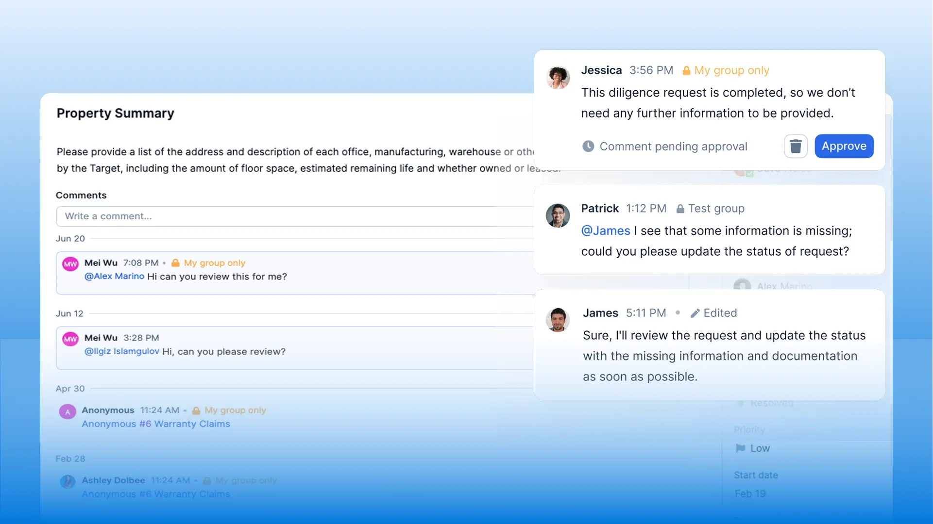 Tag teammates, comment, or start a private chat directly within requests, no more jumping between tools or email threads.