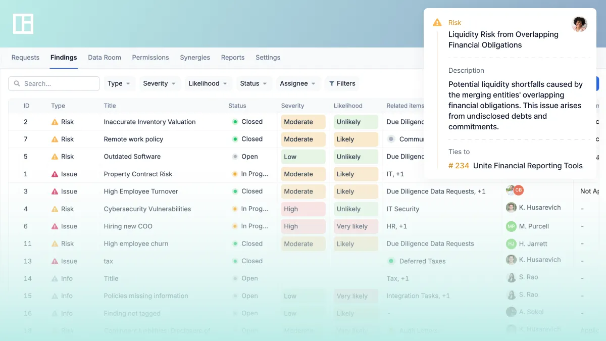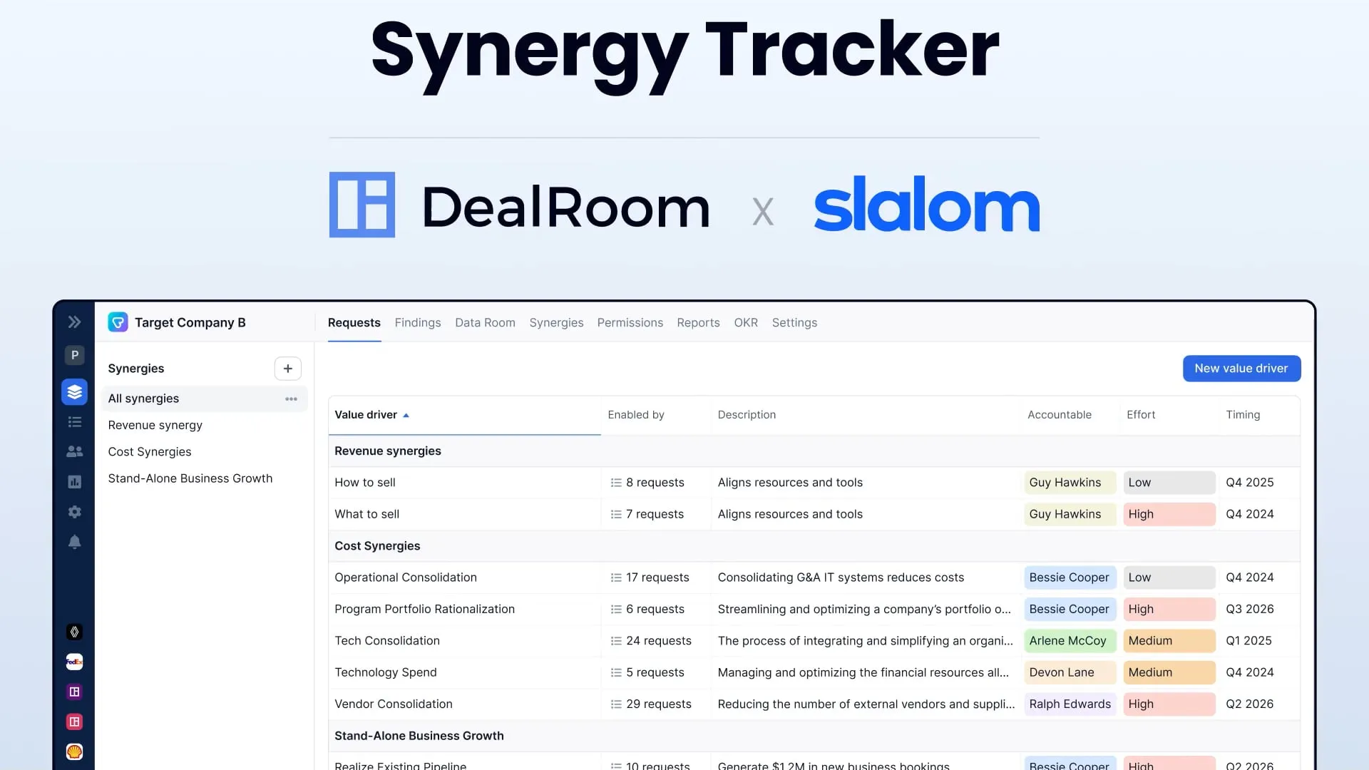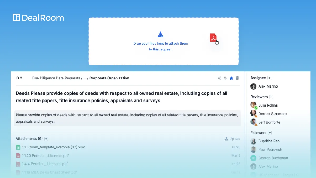 Discover first-hand how DealRoom can transform your M&A process. Book a demo to see how easy it is to manage deals, streamline due diligence, optimize integration, and more all in one platform.