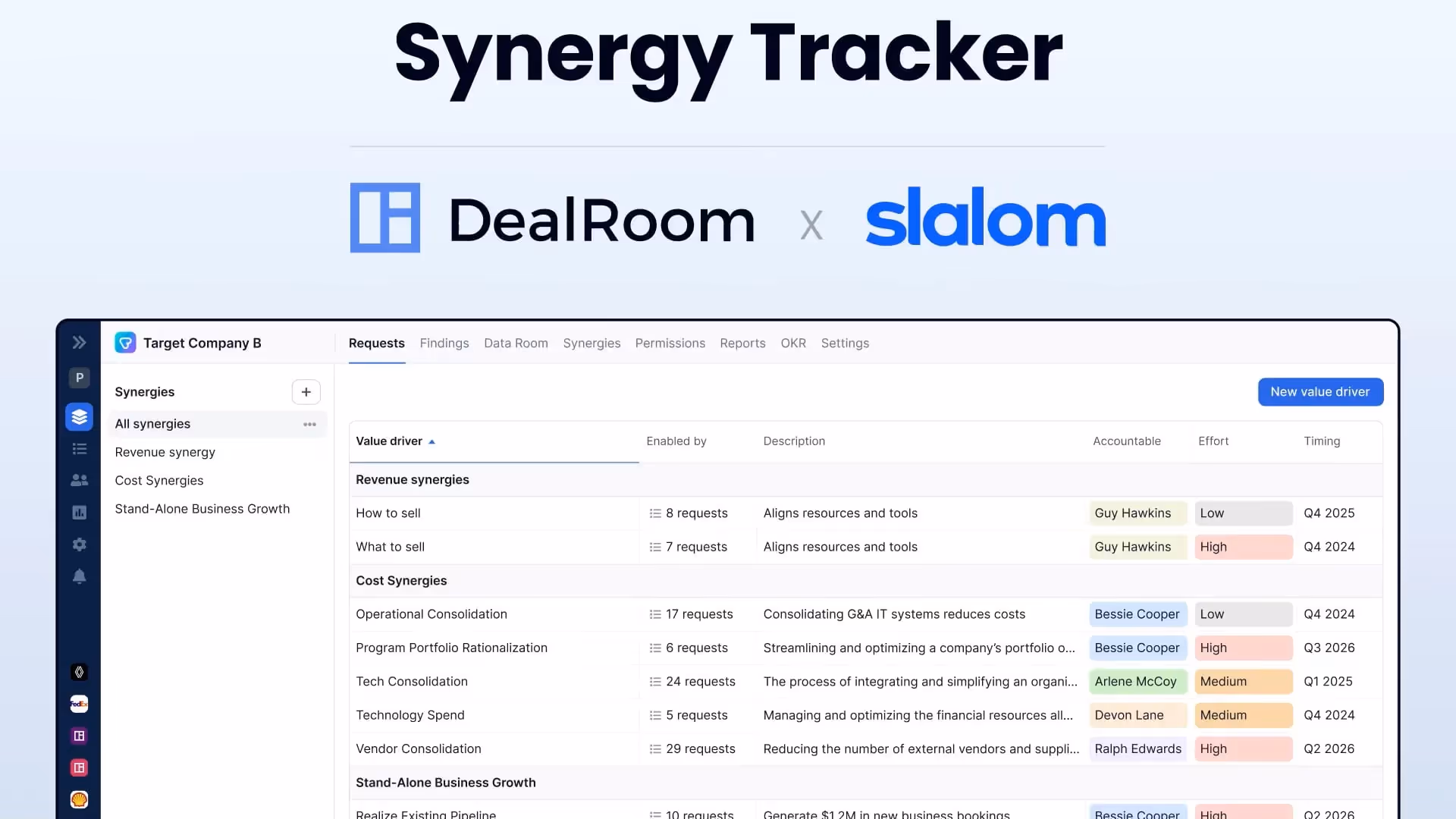 Discover first-hand how DealRoom can transform your M&A process. Book a demo to see how easy it is to manage deals, streamline due diligence, optimize integration, and more all in one platform.