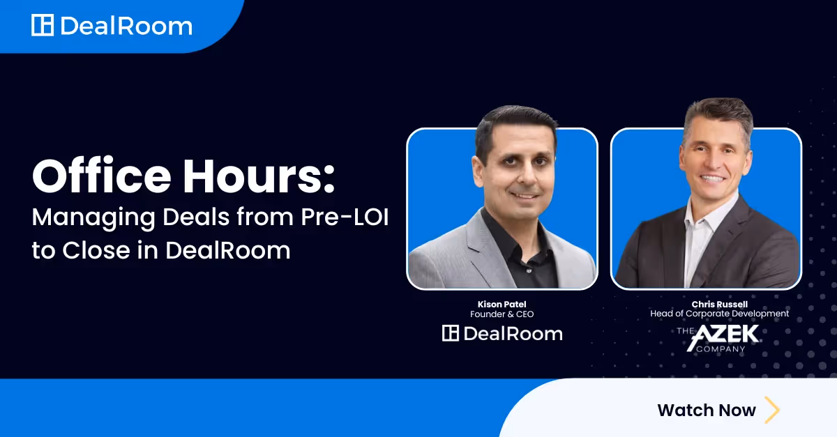 In this on-demand Office Hours session, Chris Russell, Head of Corporate Development at the AZEK Company, shared how his team used DealRoom to manage M&A deals from pre-LOI through close. Watch the recording now.