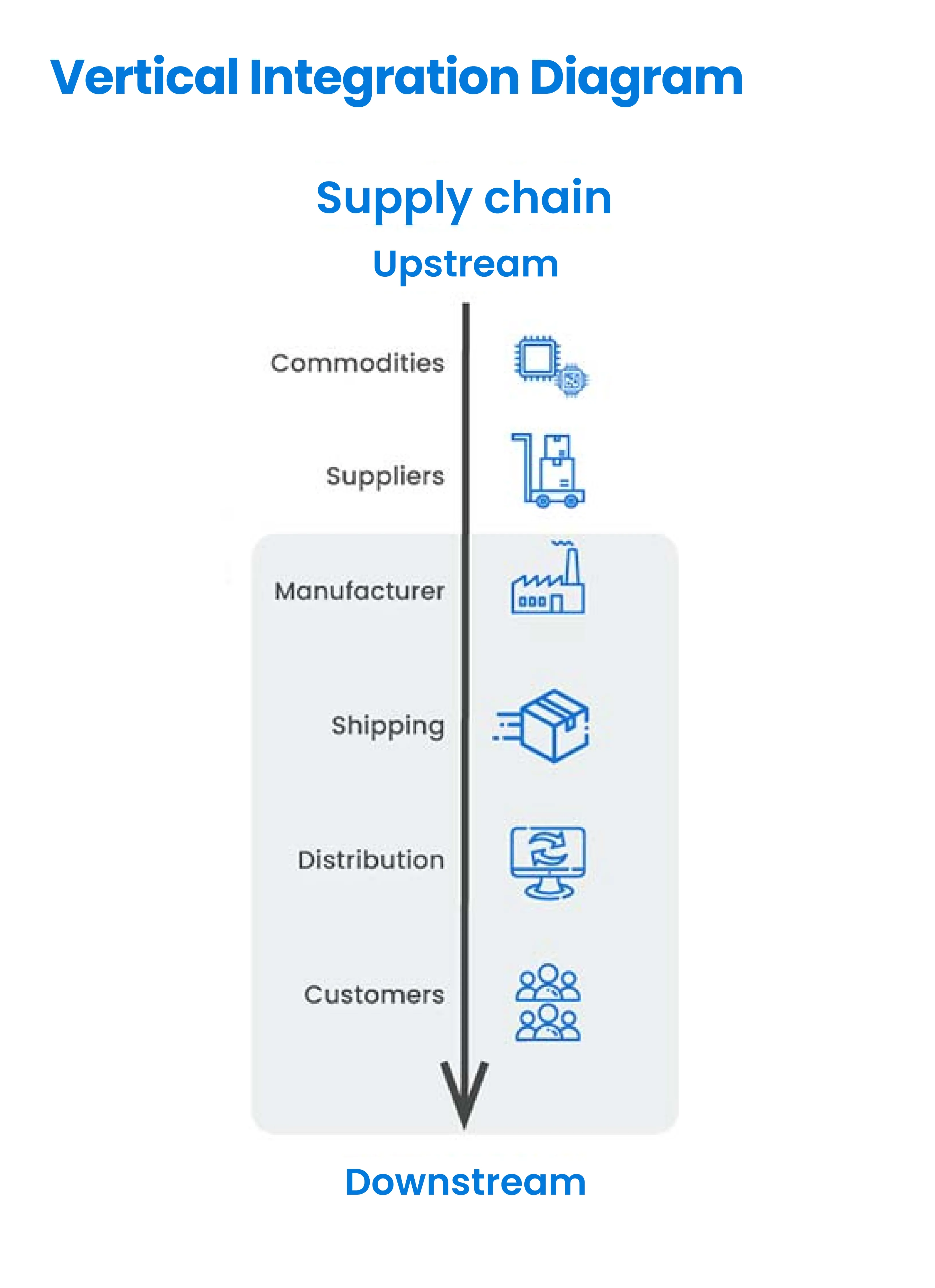 Every business in the world has a supply chain - which includes every step from getting raw materials to order fulfillment (See image above). Vertical integration happens when a company decides to own and produce in-house one of the steps in its supply chain.