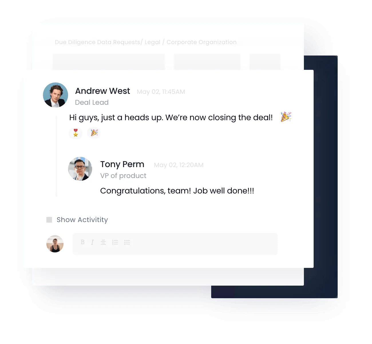 Push notifications to the channel linking back to DealRoom.