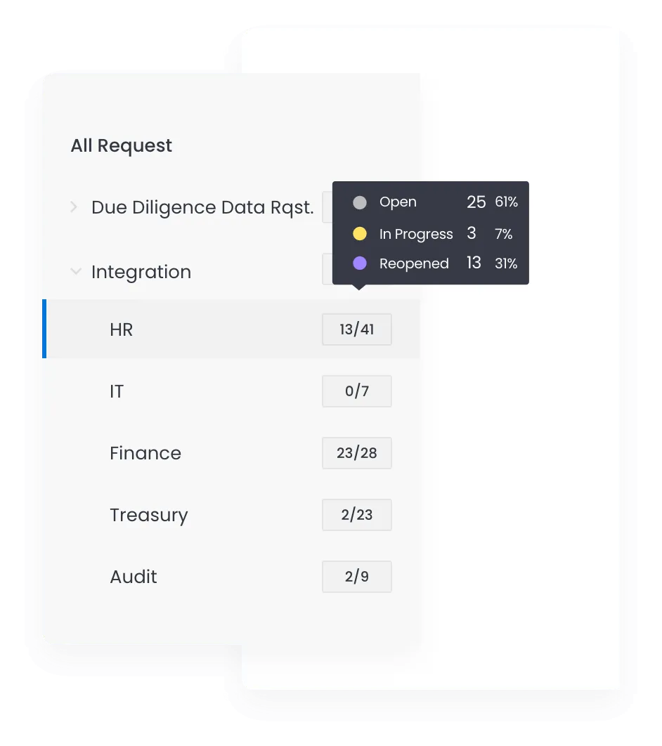 Speed up your process with DealRoom’s library of pre-made templates that ranges from due diligence, form of LOI, flows of funds, to integration and more.