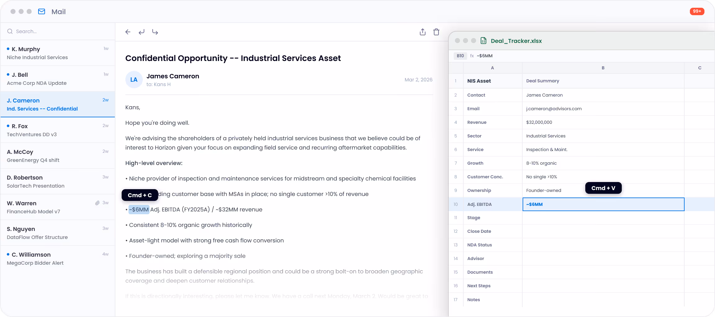 "When I get a SIM or a financial doc from a broker via email, the AI reads it and suggests updates to my deal card like revenue, EBITDA, headcount, all of it. It's turned the most repetitive part of my workflow into a one-click approval"