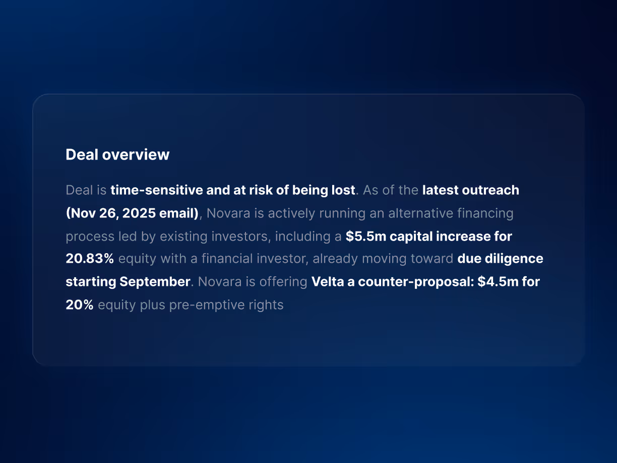 DealRoom AI generates a continuously updated overview that summarizes deal status, recent activity, and next steps, so anyone can instantly understand where the deal stands.