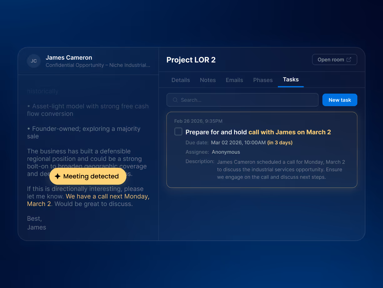 DealRoom AI detects follow-ups mentioned in emails and suggests tasks directly on the deal card with context and deadlines, so every commitment becomes trackable.
