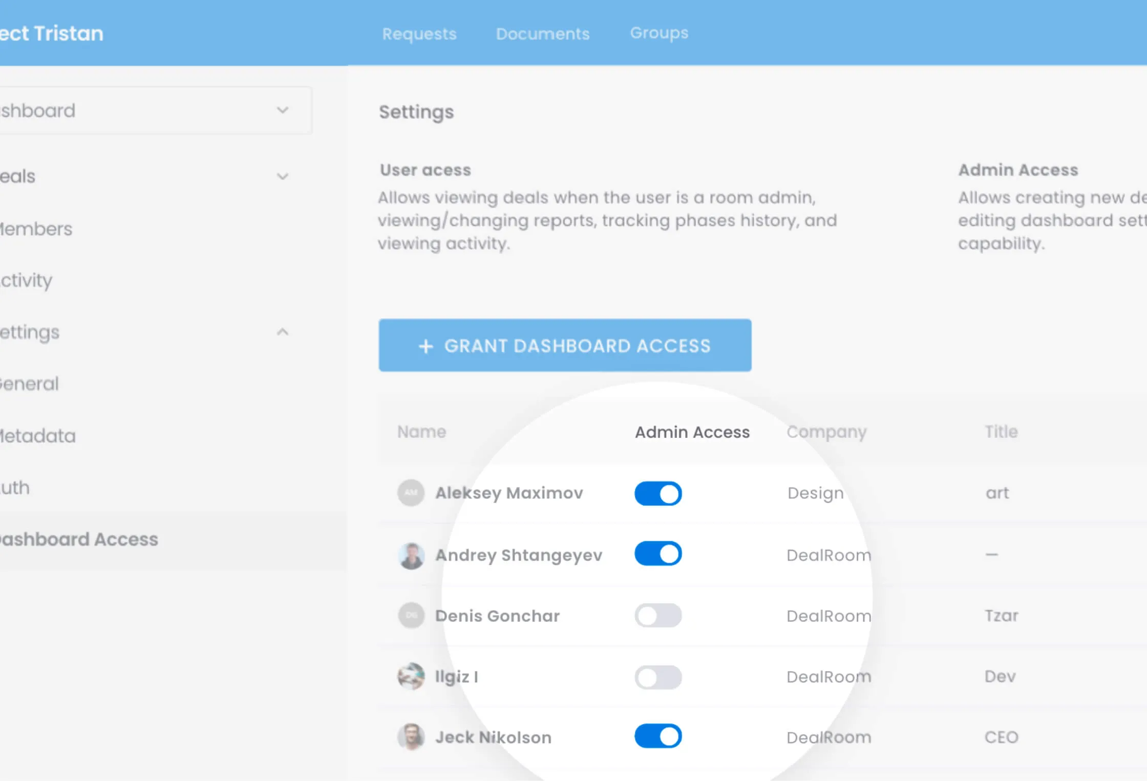 The deal pipeline access page is where admins can quickly see what type of access each user has to the pipeline. They can see users’ title, company, email, and phone number. From here, admins can also turn admin access on and off for other users, as well as grant deal pipeline access. Each user who has access to the pipeline is either a pipeline admin or pipeline general user.