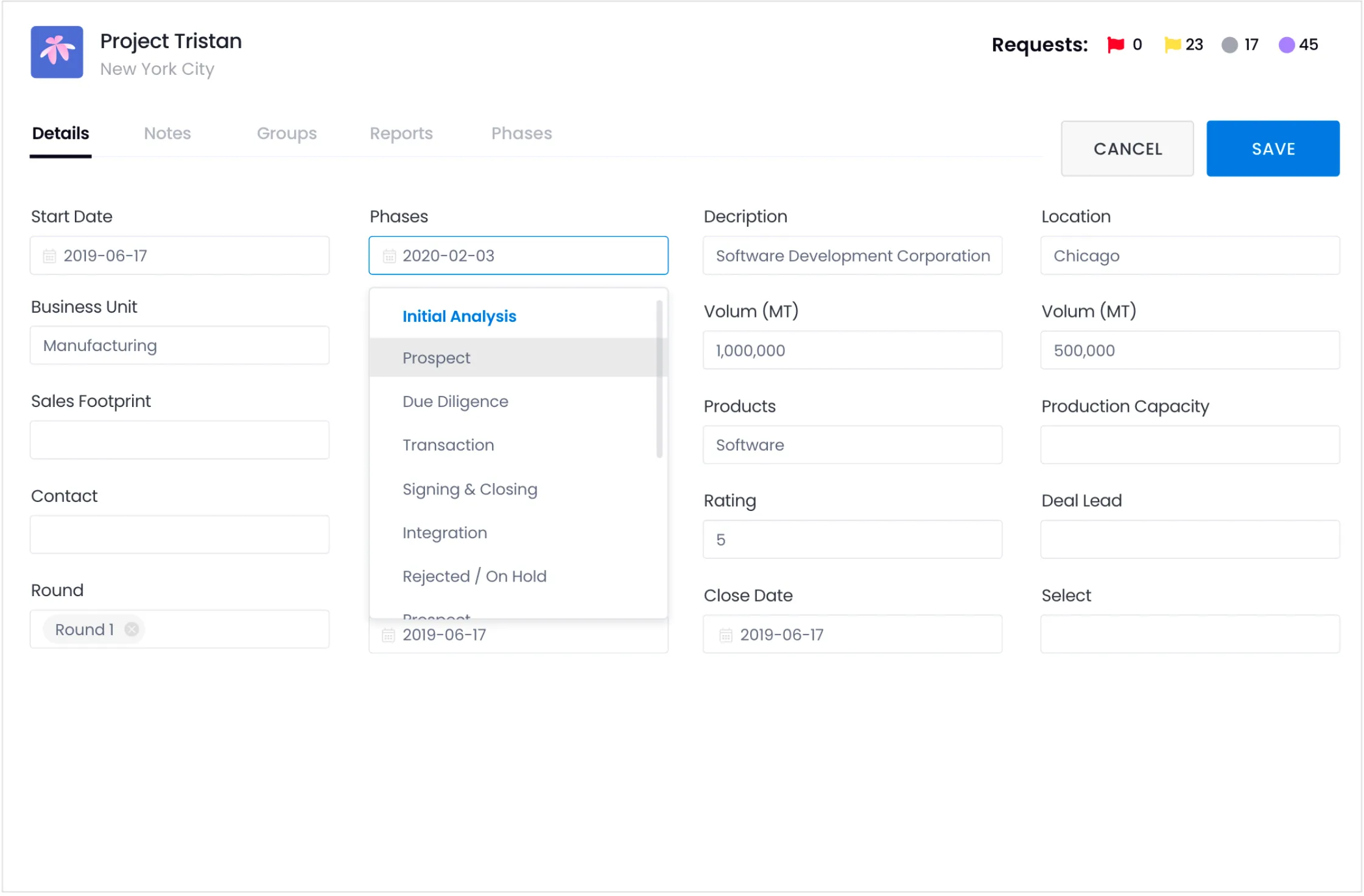 Organize deals into customizable phase sequences. Once a deal is ready for the next phase, you can change the phase sequence. For example, a deal may have the following phase sequence - initial analysis, prospect, due diligence, transaction, signing and closing, and integration. Each phase will have a planned and actual start date.