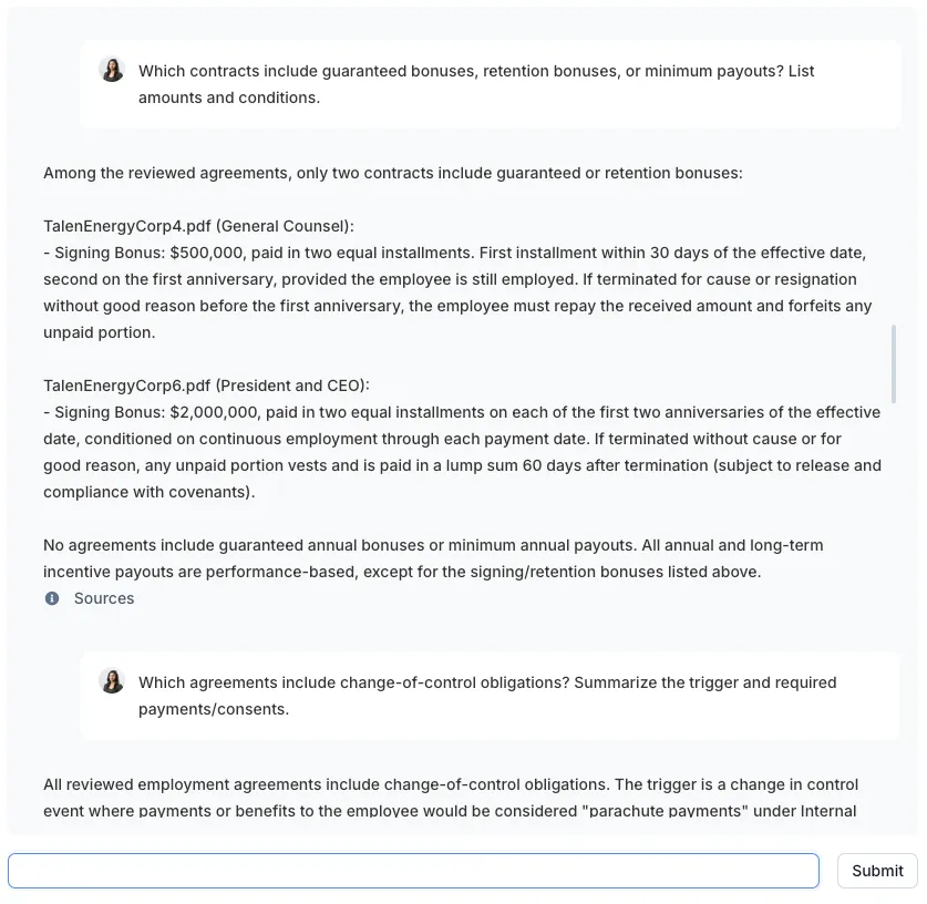 With deal-level chat, you can ask questions across all contracts at once to explore risks, inconsistencies, and obligations without reviewing documents one by one.