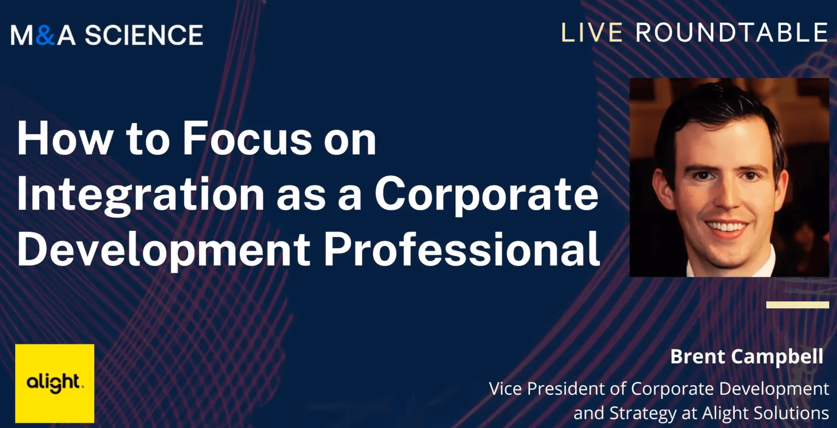In this webinar, Brent Campbell, Vice President of Corporate Development and Strategy at Alight Solutions, discusses how to focus on integration as a corporate development professional.