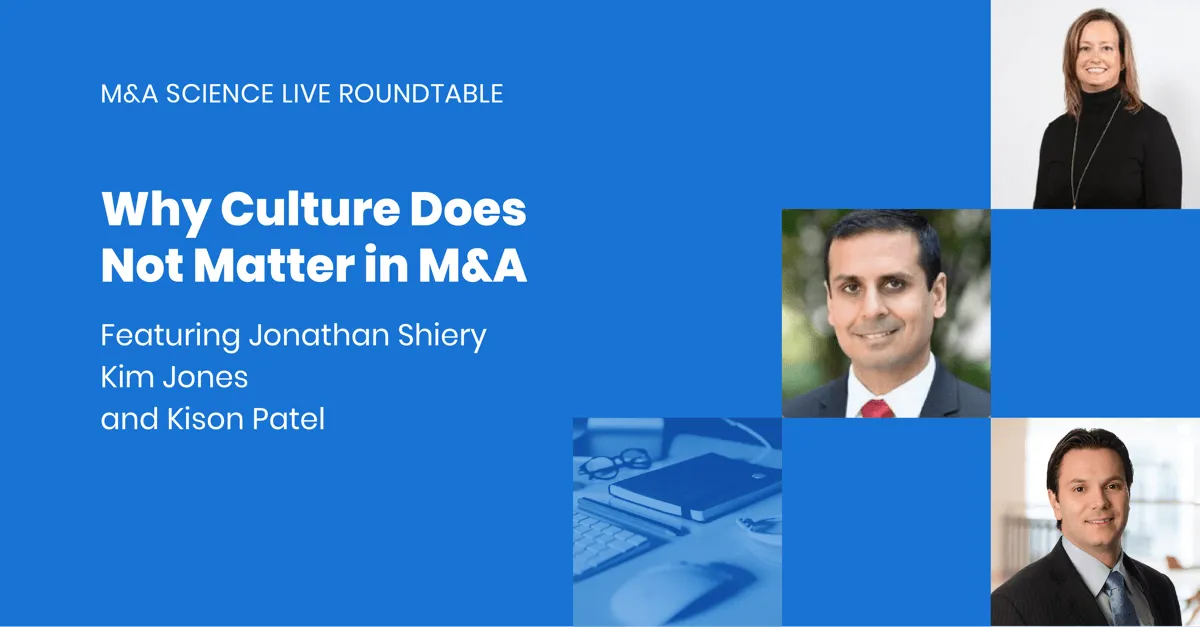Many people state culture conflict as the number one reason why M&A fails. During this discussion, we discuss an unpopular belief, culture doesn't matter in M&A. Featured speakers include Jonathan Shiery, Bill Clarkin, and Kim Jones.